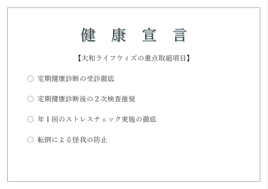 「健康宣言」を制定します。 2026-02-15 最終更新日時 : 2026-02-15 kato 私達は、社員とその家族の健康づくりを維持するとともに、社員が働きやすい環境を作り上げていくために、このたび健康宣言を制定いたします。